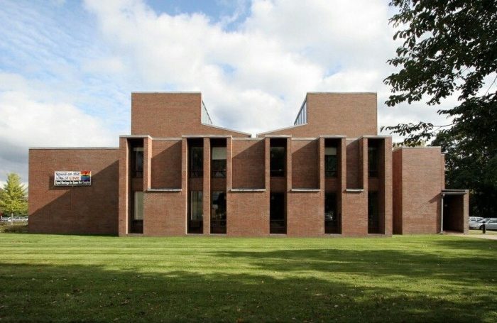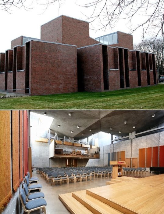 Первая унитарная церковь в Рочестере (First Unitarian Church of Rochester) – одна из самых впечатляющих работ Луиса Кана на поприще создания религиозных объектов. В ней сочетаются современная эстетика дизайна и традиционные унитарные ценности, способствующие общности и единению. Как и полагается культовому сооружению, главным архитектурным элементом должно стать святилище, которое располагается в центре здания, а вот остальные помещения, включая классы приходской школы, находятся вокруг него.