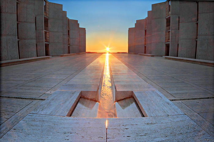 Водный объект, разделяющий архитектурный ансамбль две одинаковые половинки, стал знаковым элементом, символизирующим бесконечность (Salk Institute for Biological Studie, Калифорния)