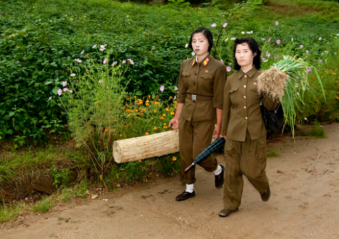 Такие сценки, которые можно часто увидеть в Пхеньяне, корейские гиды категорически запрещают фотографировать. Все дело в том, что «на Западе» их могут расценить как подтверждение того, что люди здесь голодают. Несмотря на то что рацион большей части северокорейцев весьма скромен, а трава нередко используется при приготовлении блюд, на самом деле военные вручную выщипывают пожелтевшие травинки, чтобы газон был идеальным.Женщины-военные, помогающие в работе на сельскохозяйственных угодьях, 2008 год