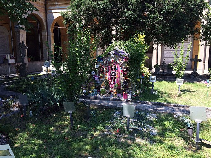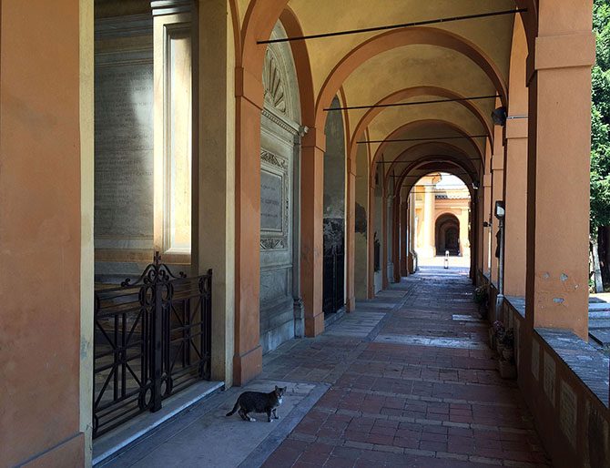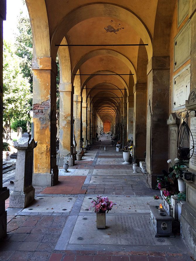 Болонья считается городом галерей и аркад — и кладбище Чертоза состоит из рядов галерей, в которых находятся склепы и колумбарии.