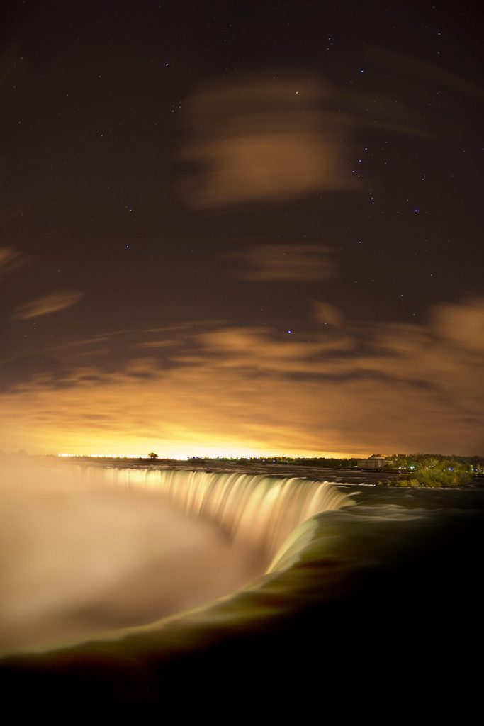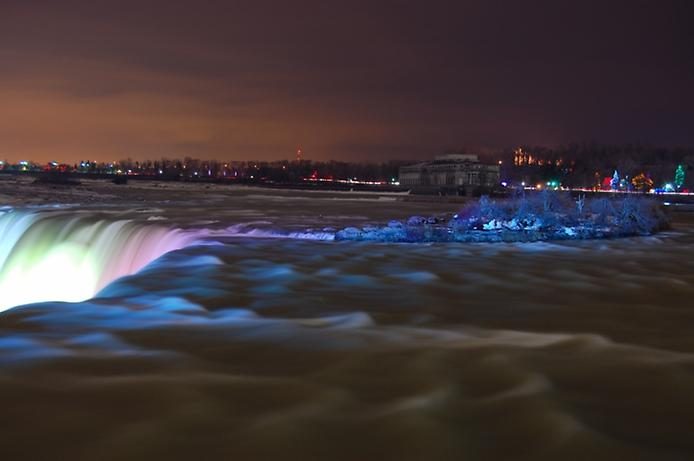 У Ниагары установлены десятки разноцветных прожекторов общей мощностью 1,5 млн. кВт. Как только стемнеет, их лучи направляются на непрерывно движущуюся стену водопада и, создавая сказочную иллюминацию, усиливают и без того внушительную картину.