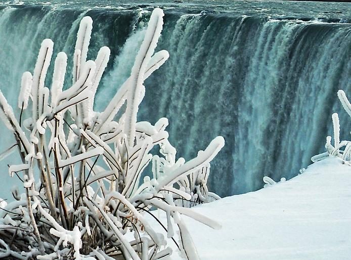 Ниагара, как и любой другой водопад, выглядит по-разному в зависимости не только от времени суток, но и от времени года. Весной и летом кипящий белый занавес оттеняется сочной зеленью, осенью — багряными красками. Зимой замерзают только края реки. Со скал-выступов гребня — постепенно намерзают огромные, с фабричную трубу, ледяные наплывы — гигантские „сосульки“, искрящиеся бриллиантами на фоне беснующейся воды. “Трубы” — это не метафора. “Сосульки” замерзших водопадов действительно полые внутри, а сквозь их прозрачные стенки можно наблюдать, как падает, пульсирует и бьется, сопротивляясь замерзанию, вода.