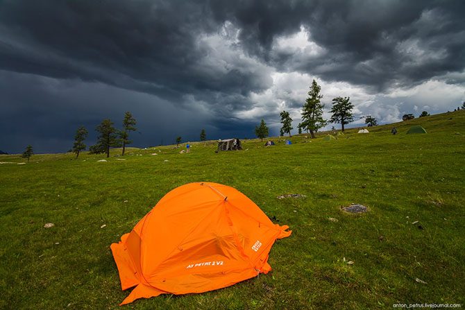Ехать туда долго. Надо быть готов к тому, что в Монголии расстояния — это очень относительная штука. Все зависит от осадков, состояния «дороги», машины и умения водителя. Но оно того стоит. Озеро Хотон, на котором мы остановились — это очень красивое место. А меня, как человека повидавшего до фига всего, очень сложно удивить. Но там хорошо. Каменистый берег, поросший одинокими лиственницами.