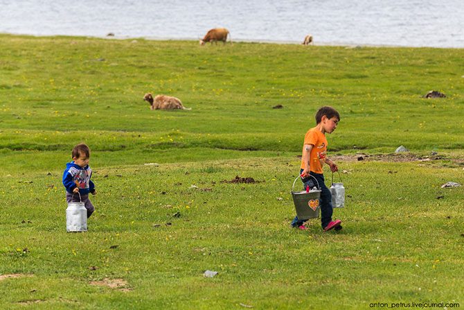 Недалеко от нас было небольшое поселение из нескольких юрт. В первый же день к нам наведалась делегация местных детей, которые продали немного сыра и молока. А к вечеру подтянулись взрослые, которые долго о чем-то разговаривали с нашими драйверами. Наверное общих родственников искали.