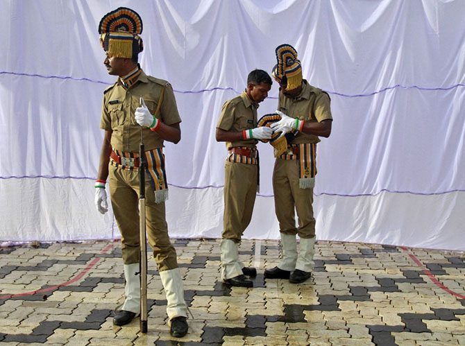 Полицейские готовятся к празднованию Дня независимости Индии в Кочи.