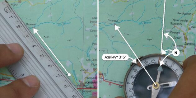 Для простоты и точности можно провести карандашом линию между точками маршрута на карте и определять азимут по ней. В полевых условия вместо этого используйте тонкую палочку, положите её на центр компаса и направьте к точке назначения на карте.