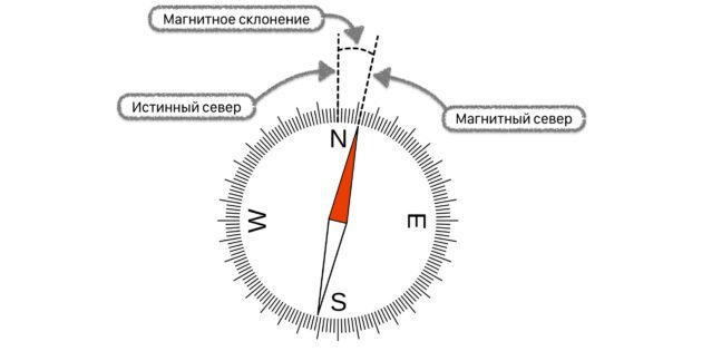 Разница между ними называется магнитным склонением. Оно может быть восточным или западным (в сторону отклонения стрелки компаса) в зависимости от конкретной локации. На коротких дистанциях до 5 км этим несовпадением можно пренебречь. Но для бо́льших расстояний желательно учитывать показатель, поскольку погрешность будет довольно существенной и может составлять до ⅓ от протяжённости маршрута.