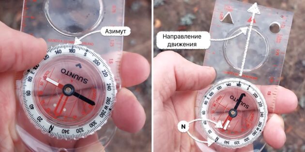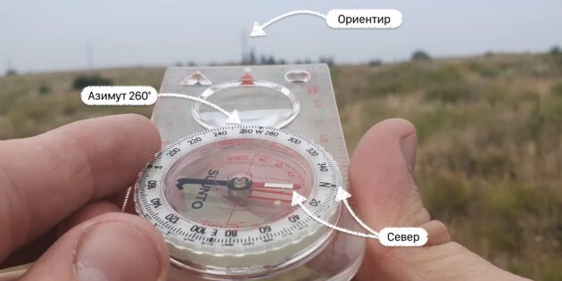 Если на приборе есть указатель, то поверните его в сторону конечной точки, запомните, какой угол образуется. Если указателя нет — просто посмотрите, какому значению на шкале соответствует направление к точке назначения. В обоих случаях это и будет нужный азимут.