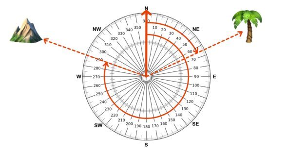 Курс, которого придерживаются при движении по компасу, называется азимут. Это угол, одной стороной которого является север, а второй — собственно направление к какому‑либо объекту. В отличие от обычных углов азимут измеряется в градусах от 0 до 360. Ноль — это север и точка отсчёта, от которой по часовой стрелке отмеряют угол до нужного места.
