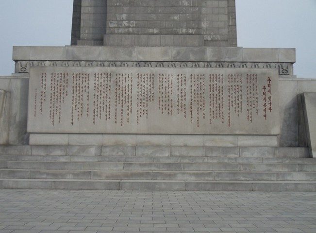 Также у основания находится 30-метровая статуя, изображающая трех идеализированных фигур, держащих молот, серп и кисть, символизирующие рабочего, крестьянина и интеллектуала. Вокруг них находятся шесть меньших групп фигур, каждая высотой 10 метров, представляющих другие аспекты идеологии чучхе.