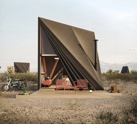 Softshell напоминает сафари-палатку и может быть использована как студия, гостевое жилье или место для уединения. Каркас изготовлен из древесины, а внешняя ткань, доступная в различных цветах, выполнена из водостойкого материала. При необходимости возможна дополнительная изоляция для холодного климата.Интерьер площадью 18 кв. м выглядит просторно и функционально. В стандартной планировке предусмотрены раскладной диван, небольшая дровяная печь, зона хранения и прикроватный столик. Опционально предлагается внешняя терраса с местом для отдыха.