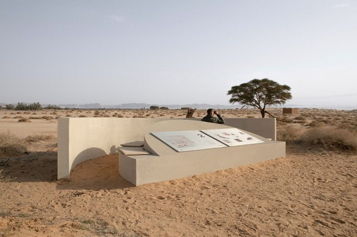 Помимо повествовательных композиций для посетителей обустроят более укромные места с самыми потрясающими видами, оборудовав полукруглые сегменты бетонными скамьями, на которых всегда найдется несколько подушек, чтобы гости смогли подольше задержаться на одном месте. Путь же между смотровыми площадками также станет частью иммерсивного обучения, поскольку в ключевых местах имеются невысокие убежища в форме полумесяца, где установлены дополнительные информационные панели и бетонные скамейки такой же формы. Эффектные скульптурные композиции обеспечивают более уединенные места для отдыха и созерцания, что в свою очередь усиливает театральность удивительного ландшафта Ал-Улы.