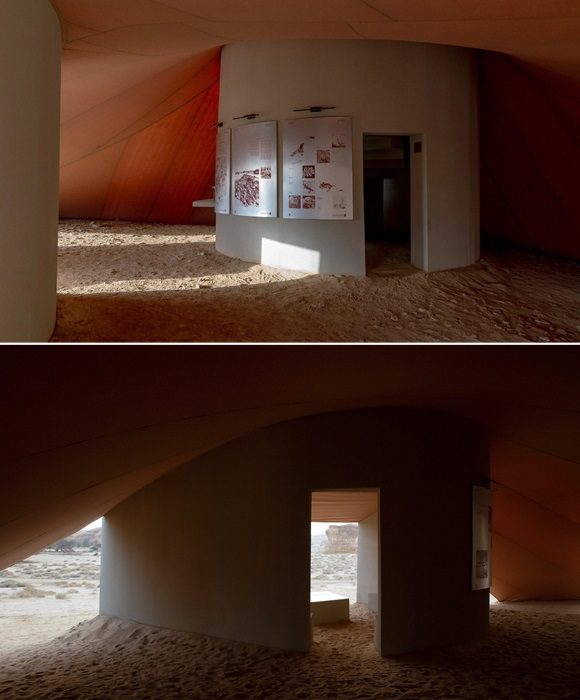 Примечательно: Пустынный регион Ал-Улы и одноименный оазис еще с доисторических времен были заселены людьми, это и стало причиной того, что его признали природным и культурным наследием, внесенным в Список Всемирного наследия ЮНЕСКО. Взятая под охрану археологическая и природная достопримечательность является местом, где нельзя строить основательные здания, что наложило отпечаток на проект. Выполнение норм экологической безопасности заставило отказаться от фундаментов, что бы сохранить целостность почвы, а также от использования вредных веществ, которые могли повлиять на окружающую среду и туристов, прибывающих на экскурсии. При этом крытые выставочные пространства установлены в стратегических местах, откуда открываются самые лучшие виды и на руины исторических объектов, напоминающих о традициях и бурном прошлом региона, и на редкое природное окружение в виде скальных образований среди пустыни.