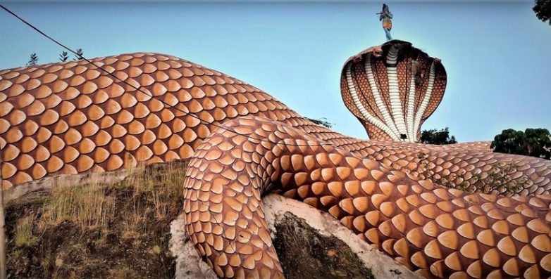 В Индии много необычных храмов: например, здесь есть храмы, высеченные в скалах, и даже храм, где поклоняются не божествам, а… карте! Но, пожалуй, самый необычный находится в штате Телингана. И, честно сказать, он мало похож на храм: с высоты кажется, что среди пушистых зеленых лесов притаилась огромная кобра. Найти его можно неподалеку от деревни Нампалли-Гутта, и стоит «змея» на пути к другому индуистскому храму.