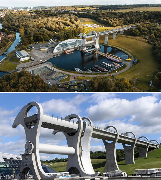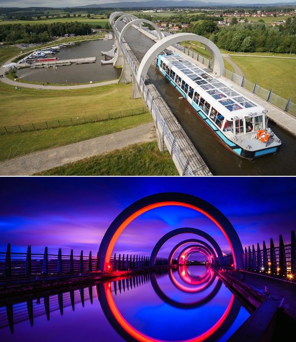 Одно из самых невообразимых инженерных чудес света также является лифтом, правда, поднимает он людей вместе с катерами и лодками. Потрясающая конструкция причудливой формы, получившая название Фолкеркское колесо, является единственным вращающимся лодочным подъемником в мире. Оно заменило серию сложных шлюзов, которые соединили два отдельных канала, расположенных на разных уровнях (перепад составляет 24 метра), ускорив движение небольших судов и прогулочных катеров в десятки раз. Теперь подъем на необычном лифте любого плавсредства вместе с людьми составляет всего 4-5 минут, причем сам процесс является довольно захватывающим аттракционом.