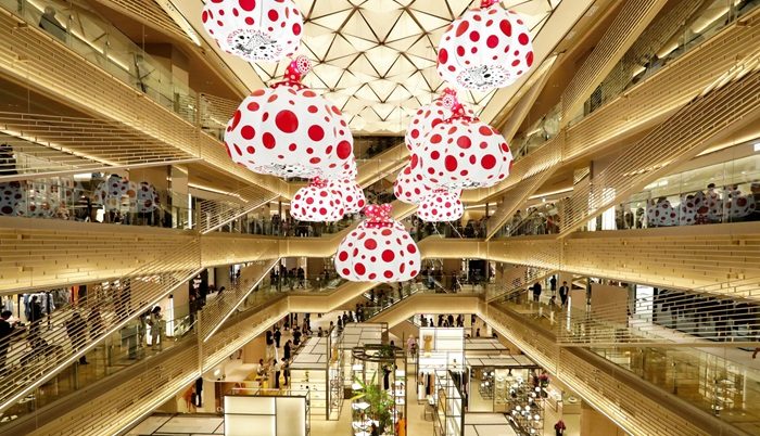 Самый известный из элитных Торговых центров Токио, стал местом, где установлена интереснейшая структура, состоящая из переплетения сотен эскалаторных дорожек. Речь идет о ТЦ Ginza Six, дизайн которого является усладой для глаз тех, кто не привык себе отказывать даже в самых безумных покупках. Спроектированная Гвенаэлем Николасом, серия эскалаторов, пересекающих все девять этажей в наполненном светом центральном атриуме ТЦ, олицетворяет движение времени. «Вращаясь» по спирали, сеть эскалаторов наполнила огромнейшее пространство уникальной и изысканной атмосферой, дающей ощущение мощной энергии и постоянной динамики.