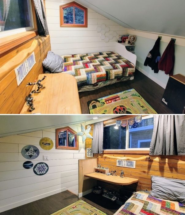 Учитывая, что отец семейства, решившегося на строительство мобильного дома, который бы соответствовал всем их потребностям, потомственный строитель, особых сложностей с проектированием и реализацией проекта не возникло. При этом Джон Донован вместе со своим отцом и братом замахнулись на более чем необычную структуру, предусматривающую съемные лофтовые надстройки, что позволяет буксировать их удивительный дом по автомобильным трассам. Хотя разрешение все равно приходится получать, поскольку габариты дома превышают предельно допустимые размеры. Построенный на мощном трейлерном прицепе от компании Tiny House Basics размером 9 на 3 метра (длина и ширина соответственно), он имеет достаточную высоту, чтобы разделить внутреннее пространство на два полноценных уровня.
