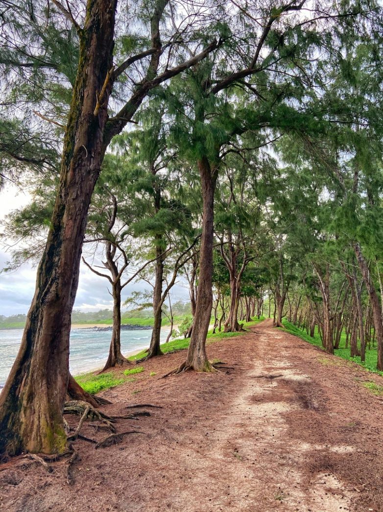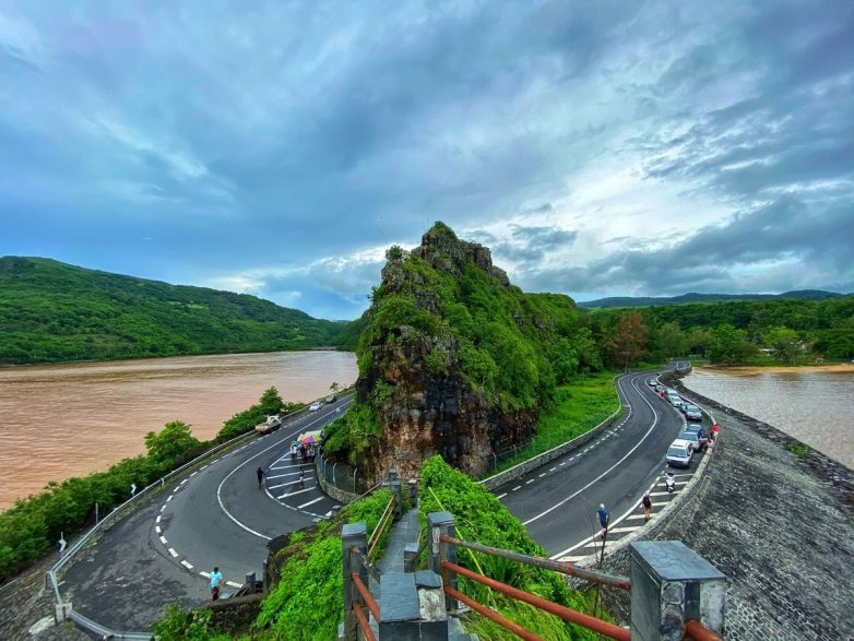 На обратном пути проехали резкий поворот на 180 градусов, и, как оказалось, это популярная локация среди туристов. Если взобраться на смотровую площадку, то, глядя на остров, видишь необычный изгиб дороги, а глядя в сторону океана — смотришь на водораздел, где мутные речные воды встречаются с индийским океаном.