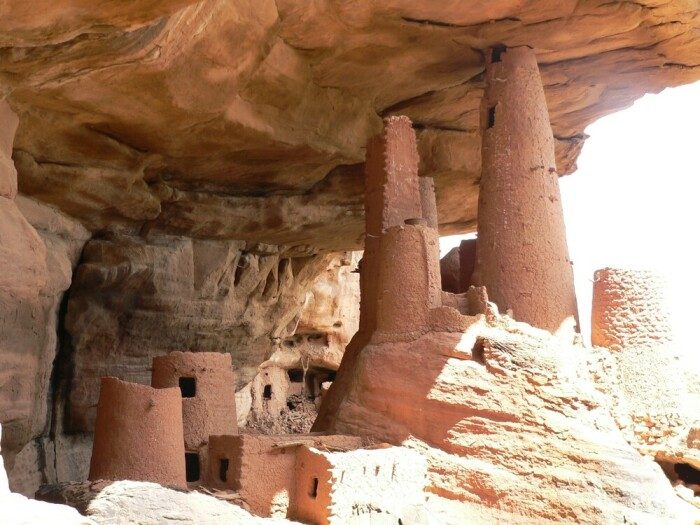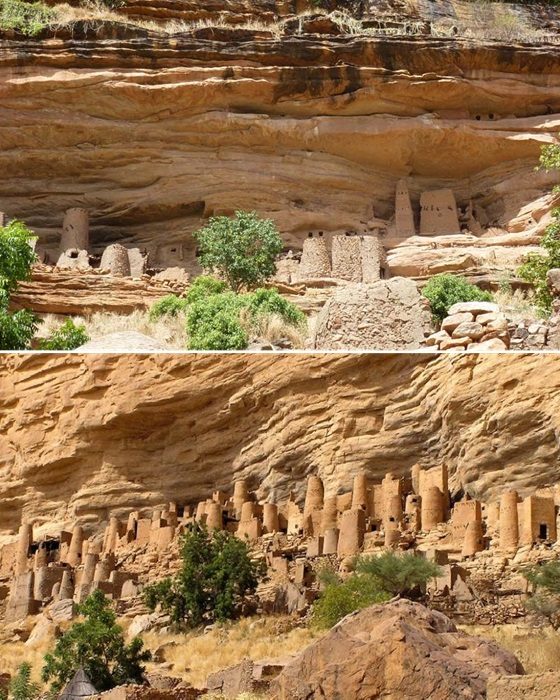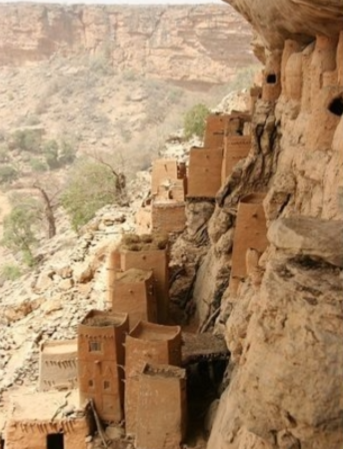 С древности люди обживали скалы, точнее сказать, пещеры, постепенно расширяя их или пристраивая надежные убежища, спасающие не только от непогоды или диких зверей. На протяжении всей истории человечества захватнические войны не раз вынуждали племена использовать более древние убежища для спасения своих семей, скота и даже веры. Не стало исключением и племя догонов, поселившееся в X-XII вв. в горном массиве Бандиагара (Мали).