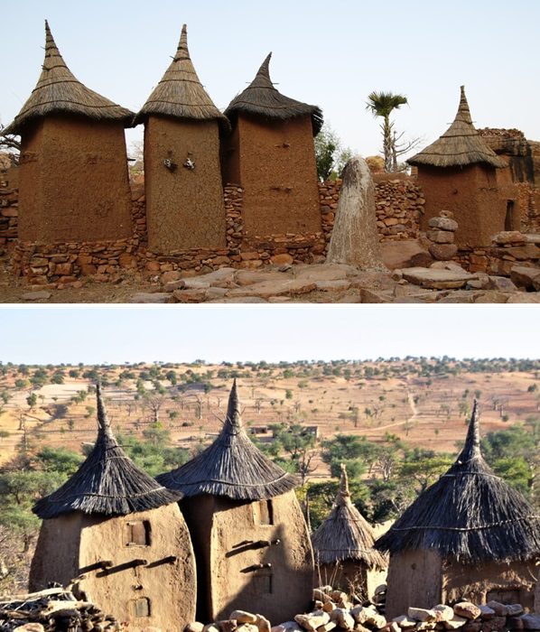 В каждой деревне всегда было скрытое от глаз зернохранилище, точнее сказать два, – мужское и женское. Как правило, они были спрятаны в самых отдаленных и неприступных углублениях скалы, куда можно добраться только по извилистой тропе деревянных лестниц, которые нужно не только обнаружить, но и изловчиться немыслимым образом, чтобы пройти по ним. Есть поселения (Тели, Ирели и Тирели), где глиняные зернохранилища идеально вписываются в скалистый ландшафт, не привлекая к себе внимание. К ним подняться не менее проблематично, а порой неподготовленным искателям приключений и чужого продовольствия и вовсе невозможно, поскольку придется спускаться просто по веревке, спущенной в пугающую пустоту с вершины плато или быть настоящим акробатом-скалолазом, способным преодолеть вертикальную плоскость без оснащения. Если же стратегически важные объекты строились в пределах неприступной деревни, то также возводились из глины, только имели куполообразную коническую форму.