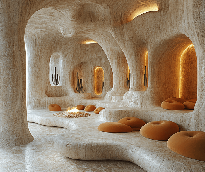 Интерьеры оформлены в минималистичном стиле с использованием натуральных тканей, плетеной мебели теплых оттенков, которые подчеркивают связь с природой, не отвлекая от открывающихся видов за огромными окнами, имеющими вытянутые овальные очертания. Кстати сказать, безрамные окна конструктивно находятся внутри номеров-башен, имитируя природные вертикальные канавки кактусов, что стало дополнительными акцентами, разнообразившими интерьер. Кроме того, каждый номер украшен скульптурными элементами, вдохновленными флорой пустыни и абстрактными орнаментами. Пока одни отсылают к «лунному пейзажу» пустыни, другие – завораживают таинственностью.