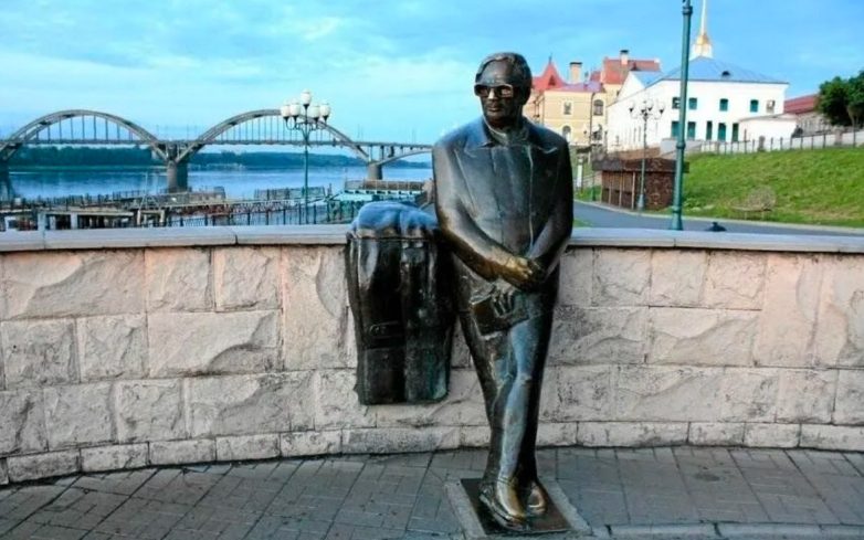 Автор этих стихов Лев Ошанин (он родился в Рыбинске. Годы жизни: 30 мая 1912 года-31 декабря 1996 года). Вот он на фото ниже, запечатленный в монументе, стоит, облокотившись на парапет.