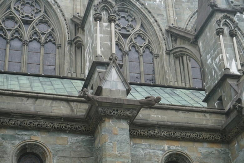 Немного отвлекусь от собора и расскажу, что в Тронхейм мы ехали из Швеции, и провели в невероятно скучной дороге что-то около 10 часов. Ночлег мы искали по пути (самое забавное было, что поиском дома занимался я, как владелец интернета в роуминге, и хозяин дома, который я снял на букинге, еще и на русском языке говорил). После того, как мы заселились и поужинали, оказалось, что город, в целом, вымер. Длинная дорога, усталость, немного алкоголя и компания друзей-раздолбаев сказались на общем настрое нашей банды, и никакой хтонический германский готический собор нас не смог бы переубедить. В общем, через какое-то время мы начали внимательно изучать собор и подмечать самые разные шутеечные вещи.