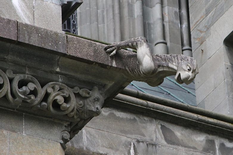 Полагаю, про этих двух есть какая-то кровавая история, но перечитывать «Круг Земной» Снорри Стурлуссона мне пока лень. Ну и при этом, среди всего этого благого народа затесалось, при чем почти по центру, пара голых фигур, вероятно каких-то мучеников. Гаргульи тоже имели местами орный вид, причем реально орный — потому что одну из них скульпторы выполнили в виде орущего викинга. Орущего в сухую погоду, и, как вы понимаете, во время дождя викинг блевал. Слава богам, что из-за позднего часа, мы могли спокойно угарать с этого, не смущая других людей.