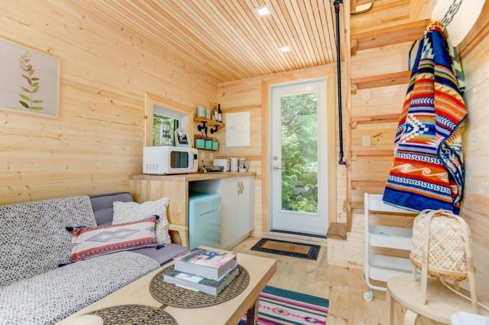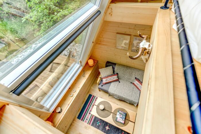 Особенности планировки и дизайна: Несмотря на миниатюрные размеры отдых в домике сулит как тишину и незабываемые впечатления, так и обеспечивает необходимым минимумом удобств. Отделка натуральным деревом, сохранившим фактуру и светлые тона, придает интерьеру деревенское очарование и обеспечивает приятные тактильные ощущения. Открытая планировка визуально увеличила жилое пространство, сделала его более объемным и вместительным даже несмотря на то, что проектом предусмотрено разделения на два уровня, да и из-за формы строения оно имеет скос и сужение к верху. Простора добавили и грамотно расположенные окна, которые способны значительно улучшить жилище и его восприятие, гарантируя, что оно никогда не будет скучным или тесным.
