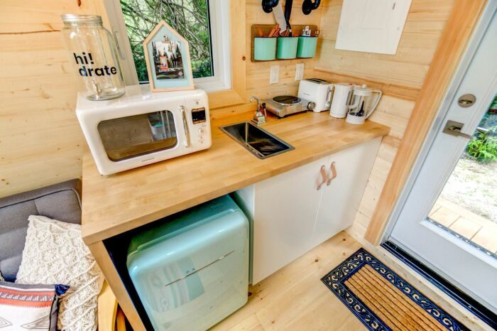 Вполне благоустроенный кухонный уголок находится прямо у входа. Он обеспечивает необходимым набором удобств, мебели, техники и посуды, чтобы постояльцы могли не покидать уединенное убежище в поисках кафе или ресторана. Тумбы, покрытой деревянной столешницей, навесного шкафа, мойки, электрической плиты, микроволновой печи и холодильника вполне достаточно для того, чтобы отдыхающие смогли самостоятельно приготовить/разогреть завтрак, обед или ужин.