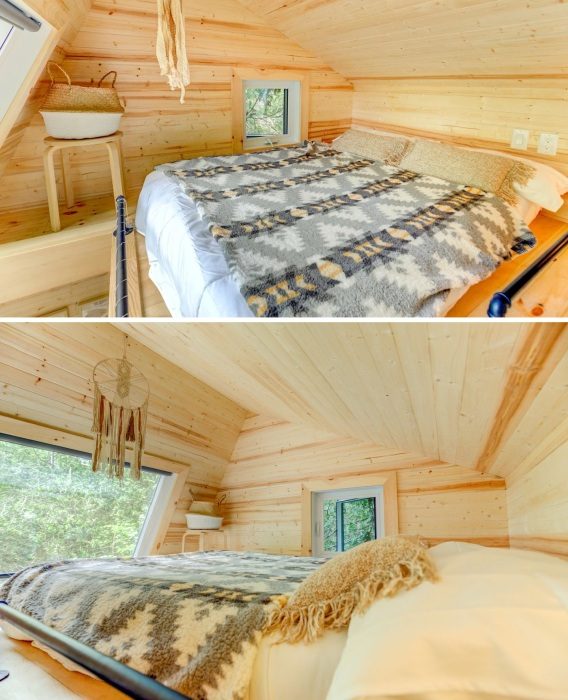 Некоторые неудобства из-за отсутствия полноценной ванной комнаты компенсирует спальня, расположенная на втором уровне крошечного домика. Обилие дерева и наличие больших окон делает ее главным местом для полноценного отдыха. А тот факт, что она расположена на значительной высоте обеспечивает как прекрасными видами, так и создает впечатление, что спишь в домике на дереве, поскольку роскошные зеленые ветки находятся совсем рядом.