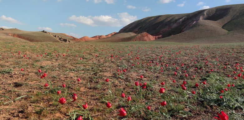 Тюльпаны не покрывают пёстрым ковром степи Калмыкии одномоментно. Каждый вид растений имеет свой период распускания бутонов. Самыми первыми оживают мелкие двухцветковые белые цветы — тюльпаны Калье, затем — жёлтые тюльпаны Биберштейна, и только после них — разноцветные тюльпаны Шренка или Геснера, занесённые в Красную книгу.