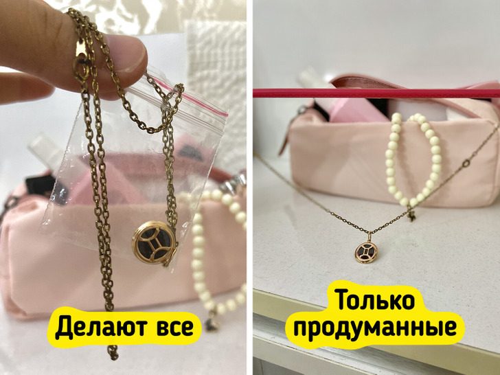 Только представьте, ваш первый вечер в отеле. Прекрасная погода, летнее платье, долгожданный ужин и… запутавшаяся подвеска. Та самая мелкая, на первый взгляд, деталь, которая может испортить настроение. Иногда это случается, даже если заблаговременно разделить кулоны, подвески и цепочки по отдельным мешочкам или секциям. Чтобы избежать такой неприятности, можно использовать очень простой лайфхак. Проденьте цепочки через обычные пластиковые трубочки. Таким образом они не спутаются, даже если их знатно потрясет и помотает в чемодане. Кстати, так же можно упаковать и браслеты, стоит лишь чуть укоротить трубочку.