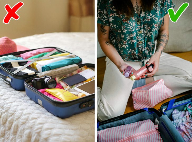 Чтобы не терять время на поиски нужного шампуня или туши, можно попробовать упаковать предметы гигиены и косметики в прозрачные косметички. Таким образом не нужно будет долго рыться в чемодане, чтобы найти заветный тюбик. А это значительно экономит время, особенно в поездке.
