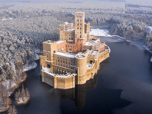 В западной Польше, в лесу Нотецкой пущи, расположено одно из самых обсуждаемых сооружений страны — замок Стобница. Его строительство началось в 2015 году, но настоящую известность он приобрел лишь в 2018 году, когда стали появляться фотографии гигантского здания в средневековом стиле на искусственном острове озера Стобница, примерно в 50 километрах от Познани.