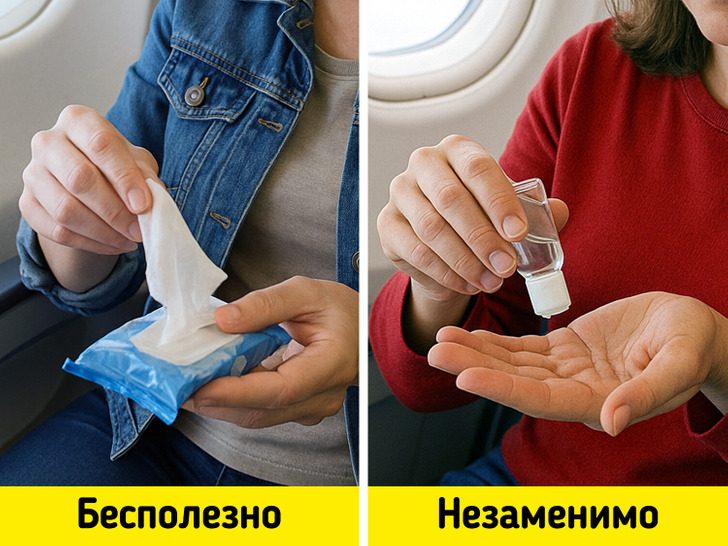 Стюарды рекомендуют перед полетом приобретать санитайзеры либо антисептики для рук. Или хотя бы антибактериальные салфетки. В их составе должны быть такие вещества, как этиловый или изопропиловый спирт, феноксиэтанол, хлоргексидин.