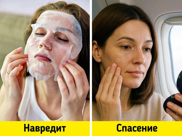 В самолете воздух сухой, поэтому маски, как и тоники с патчами, быстро пересыхают и начинают вытягивать влагу из кожи. Если без маски тяжело обойтись, то стоит четко следить за временем и не держать ее на лице дольше 15-20 минут.