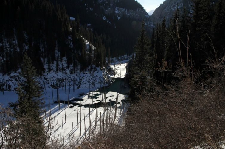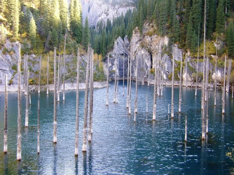 Оползень, возникший в результате катаклизма, перекрыл реку, и долина перед этим препятствием наполнилась водой. Так и образовалось озеро Каинды. Само озеро находиться в Казахстане.