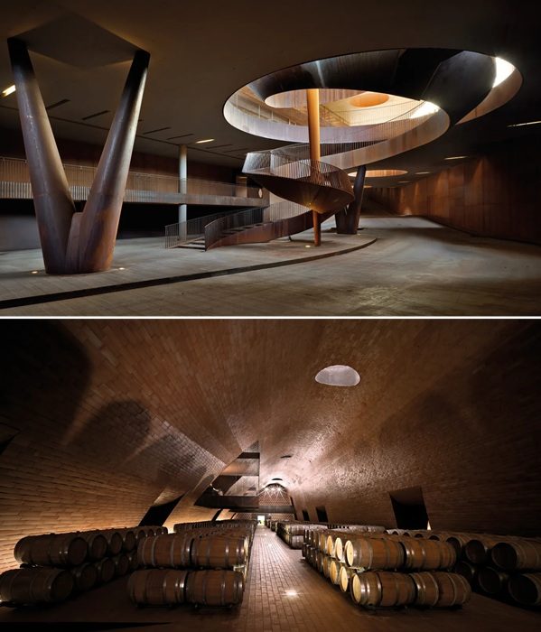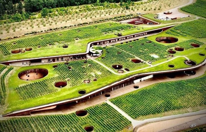 Учитывая, что общая площадь комплекса составляет 50 тыс. кв. метров, разработчикам пришлось всесторонне исследовать природный холм, в который планировалась интеграция масштабного объекта. При этом старались найти рациональные решения, уменьшающие воздействие на окружающую среду и сам ландшафт из-за того, что большая часть здания и скрыта под землей. Инновации в строительной индустрии и параметрическое проектирование свели к минимуму нарушение экосистемы за счет задействования крыши, которую практически полностью покрыли виноградниками и живой растительностью. Это позволило разгрузить сам пейзаж, восполнить посадочную площадь и улучшить теплоизолирующие свойства винодельни, что немаловажно для поддержания определенной температуры на разных этапах производства и хранения.
