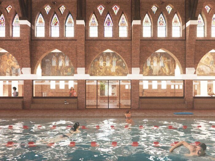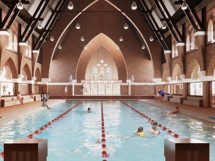 Конечно же, настолько амбициозный проект потребует довольно много изменений в первоначальном интерьере церкви, начиная со снятия существующего пола и его значительного углубления для размещения гигантского резервуара для воды, и заканчивая внедрением множества систем, обеспечивающих бесперебойное обслуживание нового объекта. Элементы исторического здания также будут перепрофилированы. Старые скамьи, например, станут местами для сидения для пловцов и барными столами для зрителей, а бывшая кафедра будет служить креслом для спасателя.