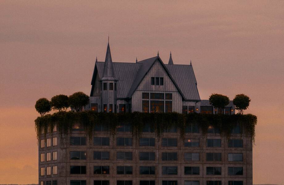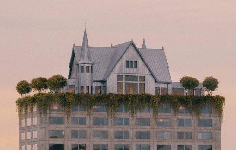 Здание выглядит сюрреалистично: это многоэтажка, которую венчает особняк в лотарингском стиле