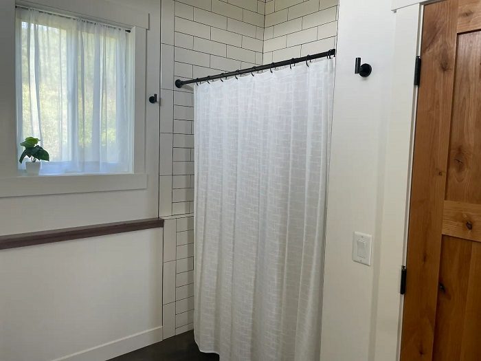 Душевая спрятана за белоснежной шторой (Grain Bin Getaway).
