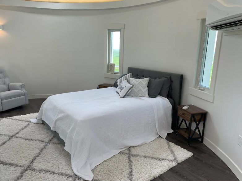 Изящная винтовая лестница, являющаяся украшением всего интерьера, ведет в спальные комнаты, которых в гостевом доме Grain Bin Getaway получилось обустроить сразу две. В одной из них установлена двуспальная кровать, имеется еще и шкаф для хранения вещей, и зона гостиной с удобными креслами. Наличие окон превращает кровать и/или кресла в более чем удобную смотровую площадку, с которой открываются потрясающие виды на живописную местность.
