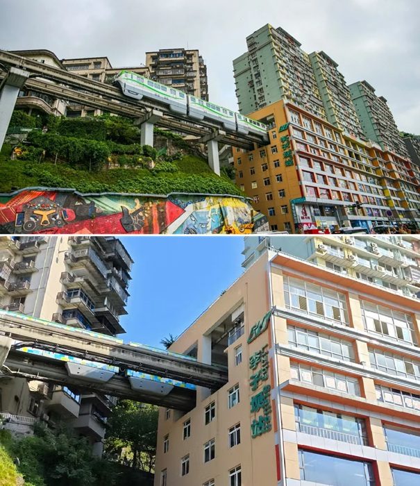 Сложная многоуровневость дезориентирует всех прибывающих в Чунцин. Для многих в этом городе непостижима вертикальная логика, которая полностью теряет смысл. Так кажется не просто так, ведь зачастую, гуляя по обычной улице можно наткнуться, казалось бы, на обычную площадь… и вдруг оказывается, что находишься на 22-м этаже Торгового центра или любого другого небоскреба. И это, не говоря о сюрреалистичной картине, которая демонстрирует, как поезда буквально проезжают сквозь жилой дома на уровне 6-8 этажа высотки (!).