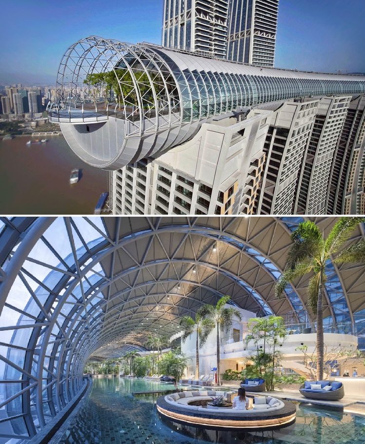 Состоящий из восьми башен, вдохновленный морской историей и китайским парусником, он символизирует ворота в город. При этом является уникальным многофункциональным комплексом, главной изюминкой которого стал 300-метровый горизонтальный небоскреб «Кристалл» с общественными и зелеными пространствами, соединенными на разных уровнях. Собранный из 9 сегментов и функционирующий как воздушный мост, соединяющий несколько зданий, он демонстрирует невиданные чудеса строительной индустрии, ведь инновационный объект выдерживает колоссальные нагрузки, связанные с трафиком большого количества людей, ветровыми потоками и потенциальными землетрясениями.