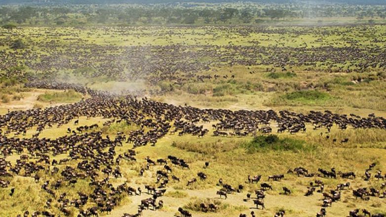 Национальный парк площадью 14 763 кв.км., расположенный в Танзании, является домом для 500 видов птиц и 3 млн. особей крупных животных. Одной из знаковых особенностей парка является миграция животных. В засушливый период октября и ноября миллионы животных устремляются с северных холмов на южные равнины, а в апреле-июне они мигрируют на запад и север. Великая миграция — потрясающее зрелище, оценить все масштабы которого в полной мере можно только с самолета или воздушного шара.