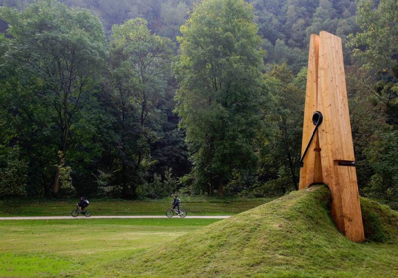 Гигантская деревянная прищепка находится в Бельгийском парке Чаудфонтаин