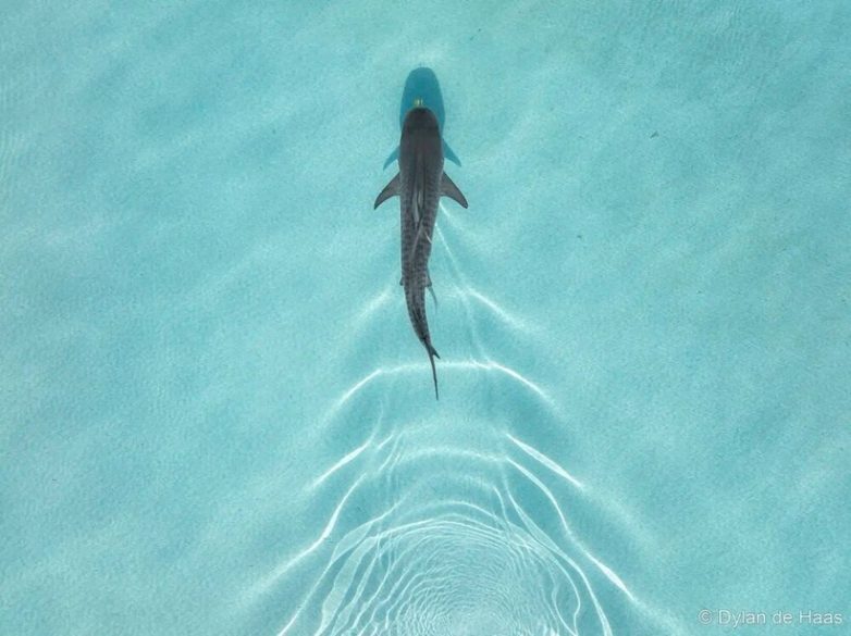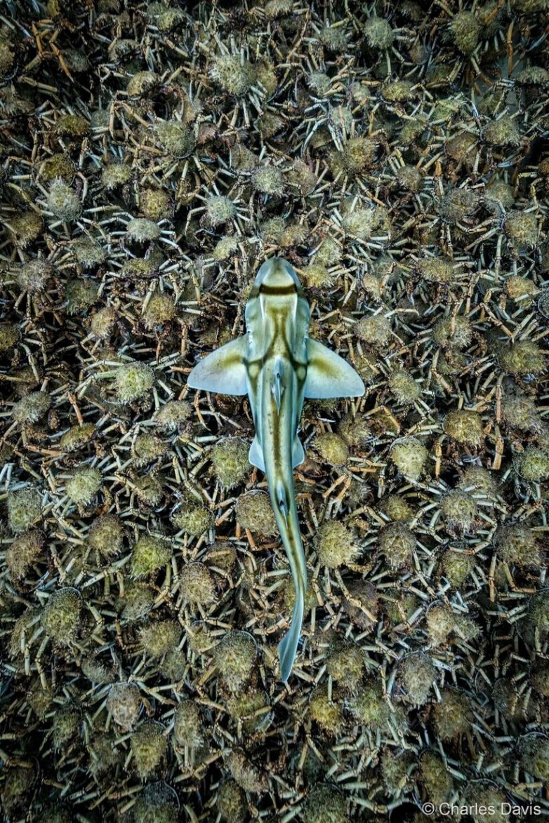 Акула скользит над тысячами крабов, собравшихся для линьки