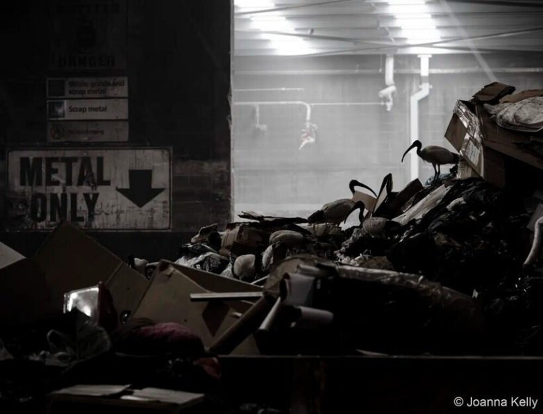 Белый ибис, поселившийся среди мусора и промышленного оборудования, сохраняет величественный вид