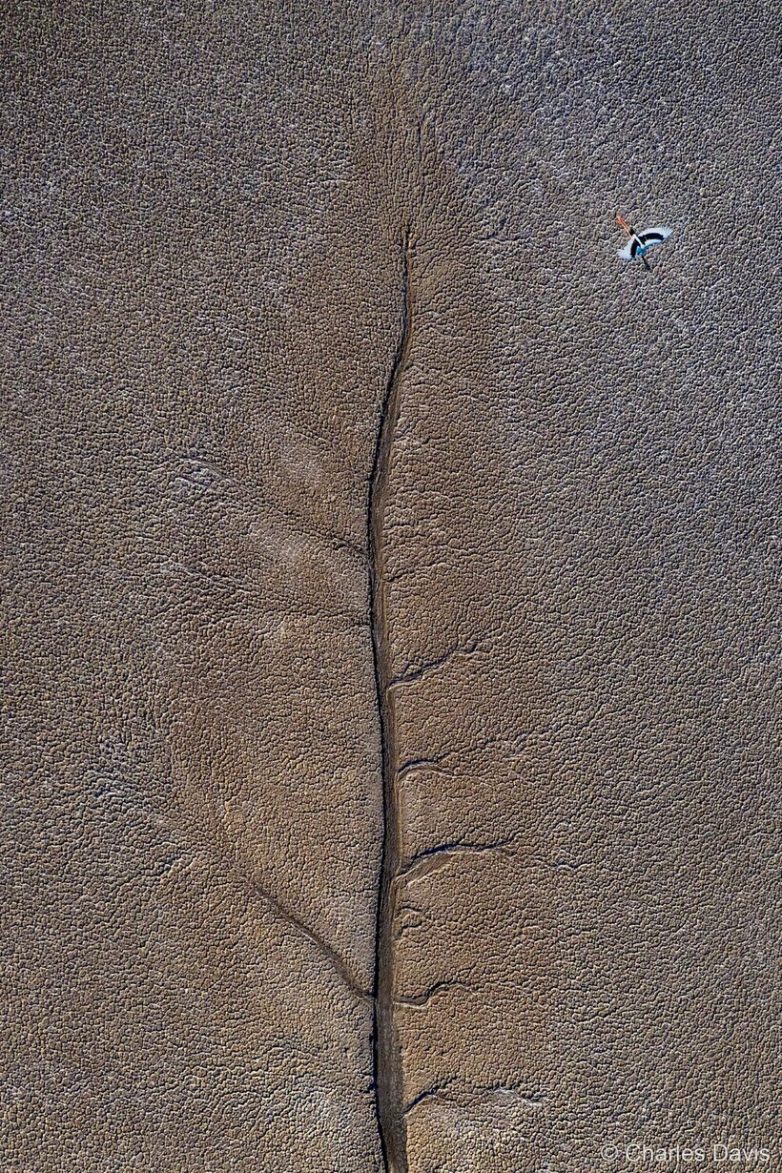 Аист летит над отливными грязевыми отмелями, напоминающими форму листа